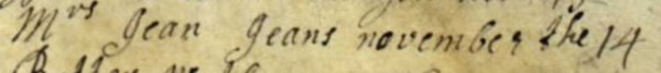 The 14 November 1727 entry of burial of Mrs Jean [sic] Jeans in St John's parish register.