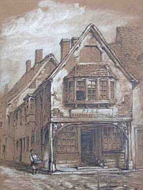 There have always been individuals who have learnt a trade and have then started their own businesses. The food industry is no different. At left, Under Bow was an old house, described as 'ancient' and 'typical of many former houses in the town' that stood in the Borough, on the corner of Grope Lane (now Wine Street). It possibly dated to the sixteenth century, if not earlier. In 1860, Under Bow was occupied by baker Charles Pyne and his family. Unfortunately, a bakehouse in such a timber structure was probably never a good idea and, in December 1861, a serious fire broke out in the bakehouse, destroying the building. |