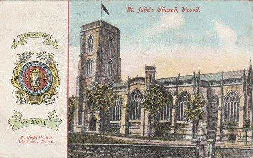 Presumably in an attempt to encourage visitors to Yeovil, William Beale Collins, stationer, printer and publisher of Princes Street, has included "Arms of Yeovil" alongside the image of St John's church in this 1905 postcard.