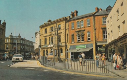 This printed postcard, from the 'bottom' of Silver Street, dates to around 1900 and is from the "Membury Series" by an unknown publisher. Henry Little's gun shop cum ironmongery was the three-storey, single-bay bow fronted building adorned with buckets and other ironmongery paraphernalia, next to the Pall Tavern (in naked brickwork!).