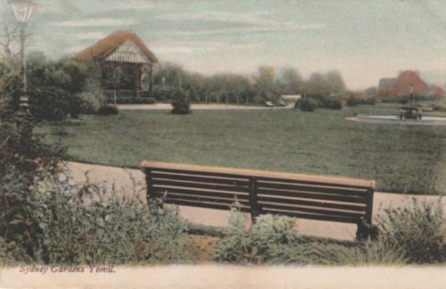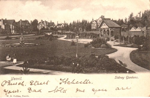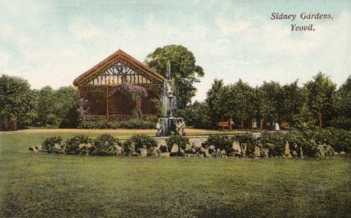 A printed postcard by WH Hallett of Yeovil, posted in 1907, featuring both the bandstand and the fountain.
