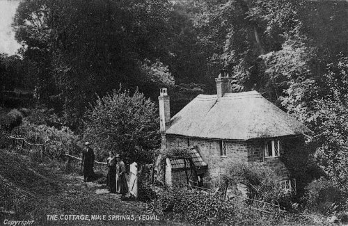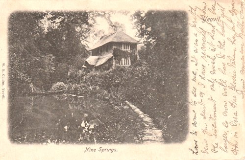 Without doubt one of Harry Thomas Balls' first postcards - this hand-coloured printed postcard of Ninesprings Cottage was posted in 1903, just after he had set himself up in business in Yeovil.