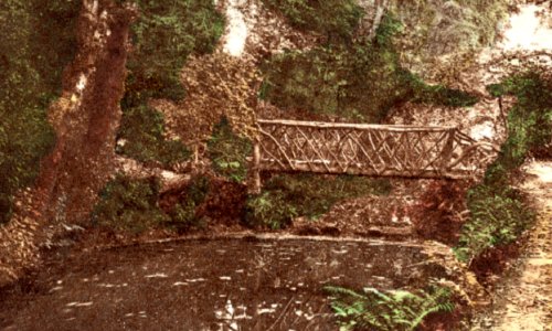 This hand-coloured printed postcard, dated 1936, shows the rustic bridge crossing the stream at the lower end of the Ninesprings valley. It was published by Photochrom in at least five versions.