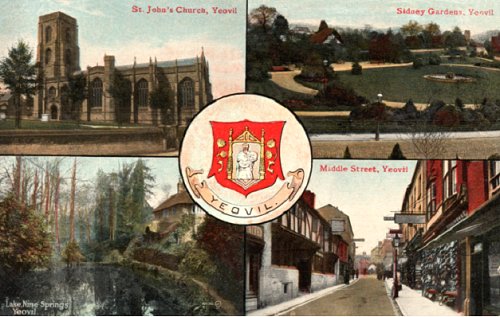 This printed multiview postcard, of 1918, is from a series of about a dozen postcards of the same period published by Yeovil stationer HT Balls. The series featured the town's crest at the centre of various views of the town. There were usually four views with a central crest in landscape orientation, as here, or two views and a crest in portrait format.