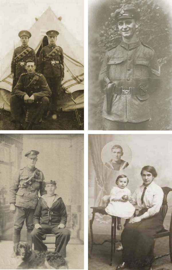 At top left is a postcard by William Ross and was taken on Salisbury Plain. The postcard of the Corporal at top right is by an unknown photographer. At bottom left is a studio portrait of two brothers (?) and the family dog, on leave or about to go to war, by Chaffin & Sons of Yeovil. At bottom right is a mother and child, with the father in a circular inset, by Walter Rendell. It is possible this last postcard is an 'in memoriam' postcard of the complete family after the husband was lost at sea.
