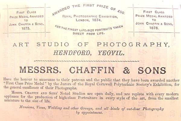 John too became a partner and advertisements began to appear for 'John Chaffin & Sons' (plural), 'Photographers of 6 Hendford' from the Post Office Directory of 1875 onwards.