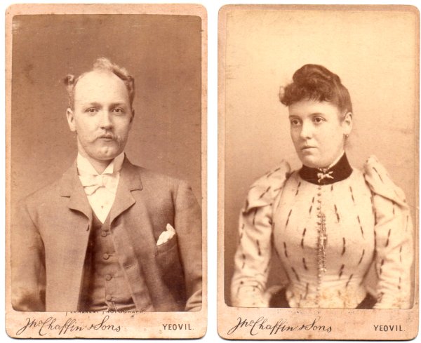 An unknown Yeovil couple, each with their own carte and photographed in the 1890s; the lady's leg-of-mutton sleeves were only fashionable during the first half of this decade and the backs (see next photo) lack the 1901 awards as listed in the following carte.