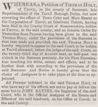 Unfortunately, in August 1859 Thomas "late Superintendent of the Yeovil Borough Police, but now executing the offices of Town Crier and Mace Bearer to the Corporation of Yeovil" was declared to be an insolvent debtor and a bankrupt.