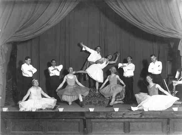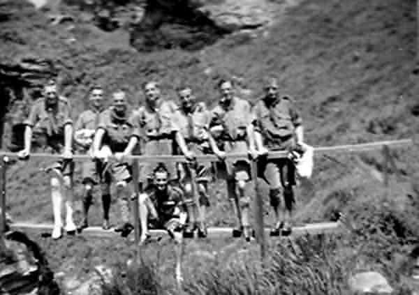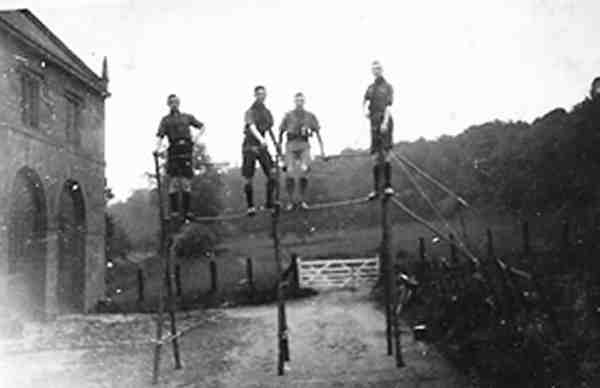 The home-made bridge supports seven Rover Scouts at Boscastle in August 1938.