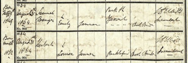 The entry of the baptisms of both Frederick and his cousin Herbert, with their respective dates of birth annotated in the margin. That Frederick's name is written here as Samuel Banger is, I believe, an error on the part of the parish clerk and is actually the name of the father.