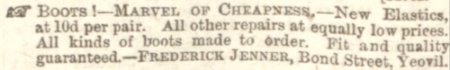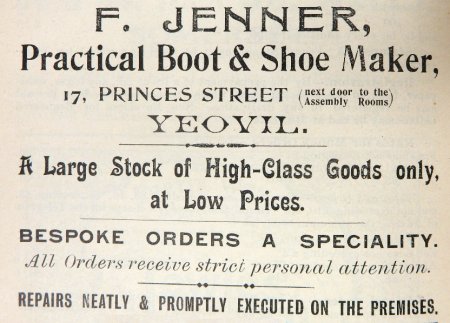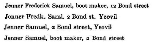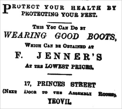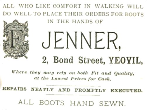 In its edition of 14 December 1889, the Southern Times and Dorset County Herald reported that "F Jenner, of 2 Bond Street, Yeovil," had been awarded a local patent "for an invention of improvements in boot fastenings."