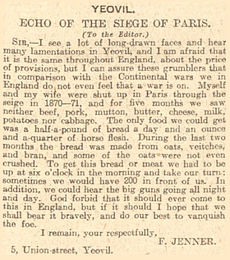 A letter to the Editor of the Western Gazette from Frederick Jenner during the Great War, describing the conditions he and Emma experienced in Paris in the Siege of Paris during the Franco-Prussian War of 1870-71. The letter was published in the 6 February 1917 edition.