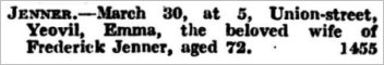 It is believed that after retiring, Frederick and Emma moved to 5 Union Street, where Emma died on 30 March 1920, aged 72. Frederick died in Yeovil during March 1928, aged 79.