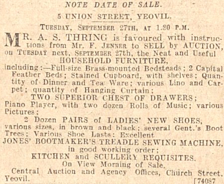 Frederick decided to retire and this is the notice of the sale of his furniture and trade tools from the 23 September 1927 edition of the Western Gazette. Frederick died the following year.