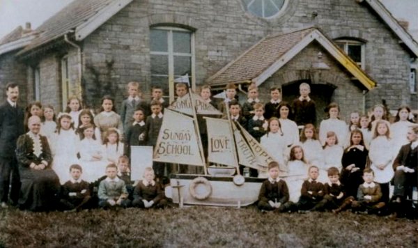 In a colourised photograph, children of the Sunday School pose with their "Sailing Boat of Hope" outside the Pen Mill Wesleyan Methodist chapel, probably around 1915.