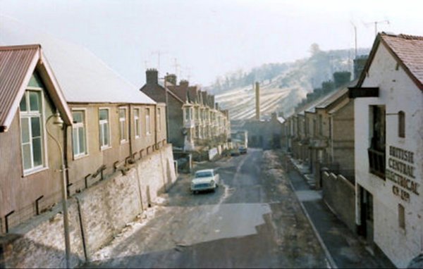 Looking down Mill Lane in a colourised wintry photograph of the mid-1960s with the green Holy Trinity Hall at left that housed the 'Teen Beat' youth club.