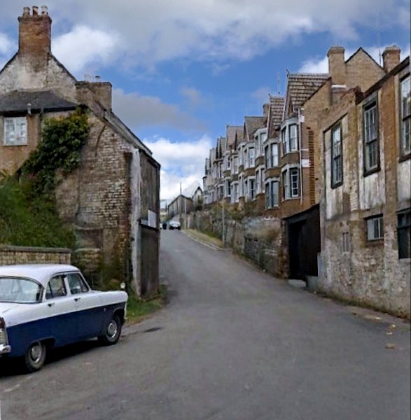 Mill Lane, seen from Summerhouse Terrace in a colourised photograph of 1963.
