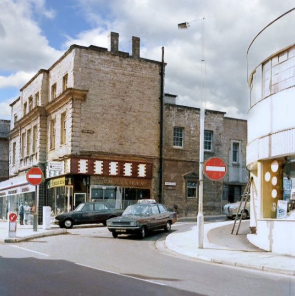 The entrance to Park Road seen from Princes Street in a colourised photograph of the 1960s. Old Sarum House dominating the picture at left, the former home of Yeovil's first mayor, John Ryall Mayo was the Chessman Café on the corner (later Prezzo which occupied the whole building, now a dental practice).