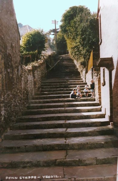 Penn Steps in a colourised photograph of around 1960 by Yeovil photographer HA 'Jack' Cooper and produced as a postcard.
