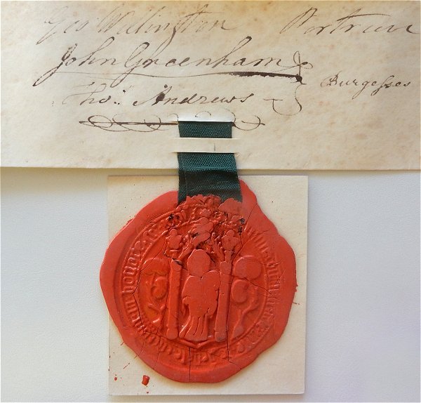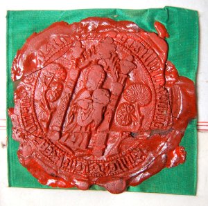 The seal impression in this photograph measures three inches (75mm) across and is reproduced here almost actual size (depending on your screen resolution). Impressed into red candle wax, it was placed on a bright green silk square attached to the vellum (calfskin) document.