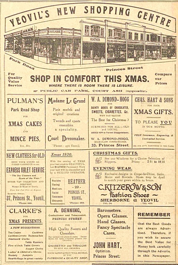 The advertisement for "Yeovil's New Shopping Centre" from the 12 December 1930 edition of the Western Gazette. Some of the names will bring back memories for many older Yeovilians.