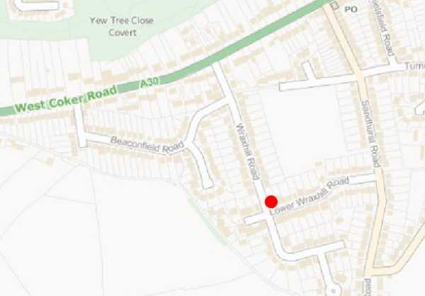 The location of St Mary's and All Saints church, indicated by the red dot, on the corner of Wraxhill Road and lower Wraxhill Road.