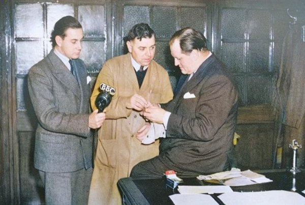 Around 1953 the BBC visited the Yeovil Glove Company to record a programme of "Down Your Way" for the BBC Home Service. This colourised photograph shows Mr Hillard of the Yeovil Glove Company explaining the glove making process and products to the BBC's interviewer and programme host, Richard Dimbleby.