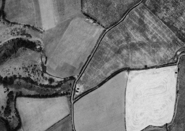 This photograph from the 1946 aerial survey, shows the junction of Street Lane and Landshire Lane, long before the farm was built. From what appear to be scorch marks, the Starfish site covered the triangular field running to the top right.