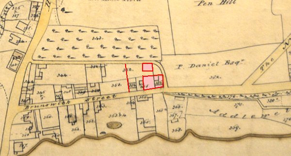 The section of Edward Bullock Watts' map of 1831, some six years after the indenture under discussion, showing in pink the location of the freehold parcel adjacent to Brunswick Street - the "New Road of the said Peter Daniell", with the leasehold parcel to its north. It also confirms "bounded on the East by land of the said Peter Daniell".
