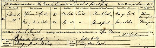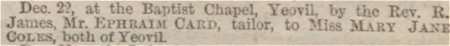 On 22 December 1872 Ephraim married Yeovil-born Mary Jane Coles (1852-1912). Although the Western Gazette announced that their marriage took place at the Baptist Chapel in South Street, the marriage actually took place at Holy Trinity church in Peter Street.