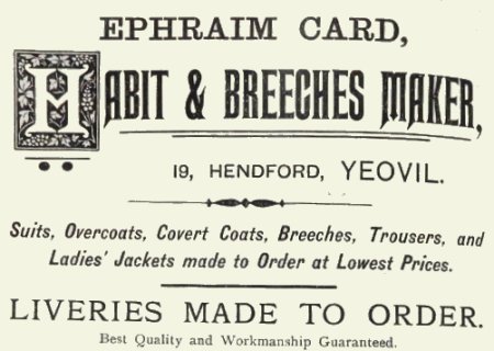 Ephraim died in Yeovil in the early spring of 1927, aged 74. Albert carried on the tailoring business which was advertised as 'E Card & Son, Tailors of 19 Hendford' in Kelly's Directory of 1935 and finally in Edwin Snell's Directory of 1954. Albert died in 1961.