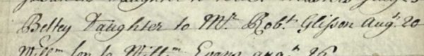 The record of the 20 August 1729 baptism of Bettey Glisson from St John's parish register. The fact that Robert Glisson is attributed the title 'Mr' - one of four men accorded such title out of 54 - indicates the esteem with which the young 20-something Robert Glisson was held.