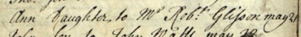 The record of the 21 May 1737 baptism of Ann Glisson from St John's parish register. Again, Robert is attributed the title 'Mr'. The fact that Ann does not appear in later records indicates that she likely died in infancy although her burial does not appear to have been recorded in St John's parish register.