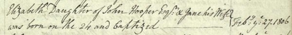 The record of Elizabeth Hooper's birth of 24 February 1806 and baptism of 27 February 1806 in St John's parish register.