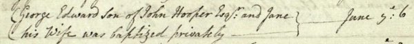 The record of George Edward Hooper's private baptism of 6 June 1800. A private baptism usually inferred that the infant was unwell and not expected to survive and the baptism was therefore usually held at the home. George, known as Edward, in fact, did survive and became a surgeon of Hendford. He died in late 1850 or early 1851, George Hooper's will was proved on 29th March 1851.