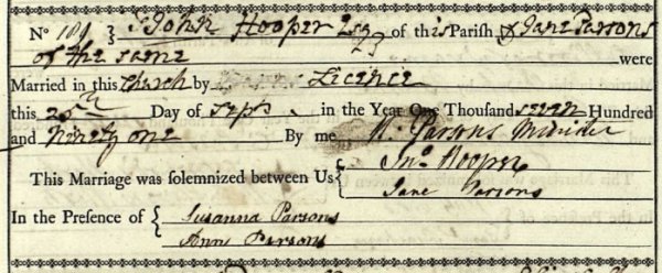 On 25 September 1791, at St John's church, 35-year-old John Hooper Esq married 25-year-old Jane Parsons (1766-1823) by license. They were to have eight children, all born in Yeovil; James (1793-1849), Jane (1794-1834), Jonathan (1795-1865), William (b1799), George Edward (1800-1851), John (b1801), Matilda (1803-1824) and Elizabeth (b1806).