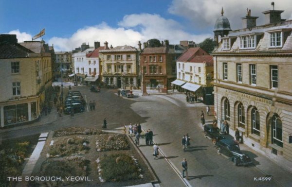 The Borough photographed in the mid-1960's. It has changed very little since then. Note that Frederick Taylor's store is now three storeys high, with a fourth floor added in the new Mansard roof. At left, in the building next to Taylor's, is the Yeovil branch of Martins Bank Ltd.