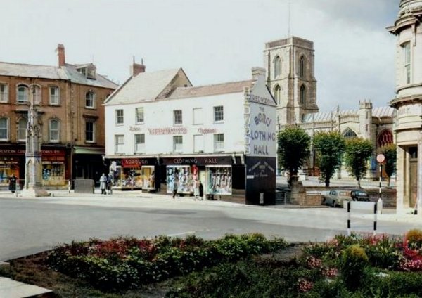 Looking east across the Borough, circa 1960. The building to the immediate left of the War Memorial now has a flat roof.