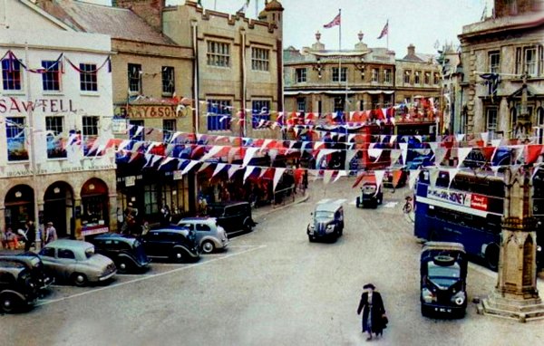 A colourised photograph of the Borough in 1958, when the bus stops were behind the War Memorial.