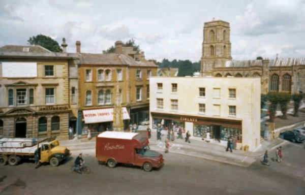 A colourised photograph of the mid-1930's looking across the Borough to Middle Street at left, Boots the Chemist in the old Medical Hall, Wine Street and the Borough Restaurant at right, formerly the shop of William Maynard who created the "Prize Medal Royal Yeovil Sausages" enjoyed so much by Queen Victoria. The Medical Hall was destroyed during an air raid in the Second World War.