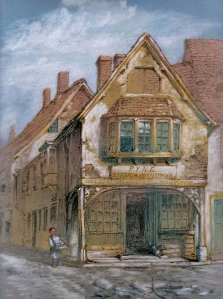 An original pastel and pencil sketch on paper (255mm x 190mm) of Charles Pyne's establishment 'Under Bow', showing part of the Wine Street elevation at the left. The sketch is by artist Walter Francis Tiffin (1819-1890) of Salisbury, Wiltshire - although at the time of this sketch he was in Sherborne. An attached label reads "Sherborne, W Tiffin, 1865" and a second label, in pencil, reads 'By W F Tiffin'. Although the sketch is dated two years after the building's final demolition, this is almost certainly a worked-up version of a much earlier sketch - possibly dating to the early 1850s.