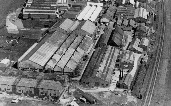A wartime aerial photograph of the Westland aircraft factory buildings with camouflage paint applied. Note especially the large building at bottom left, very effectively disguised as a row of semi-detached houses.