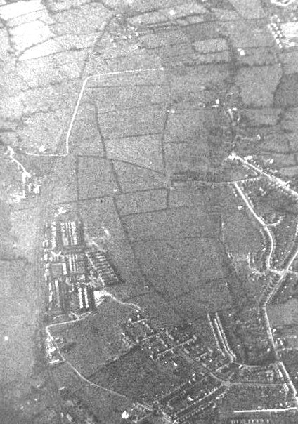 A grainy wartime aerial photograph of the Westland airfield, covering pretty much the whole of the centre of the photograph, but disguised as a number of small fields with oil poured on the grass to look like field boundary hedges.