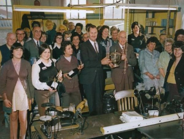 Staff of Denner and Vaughan celebrate winning the Export Challenge Cup, donated by the Worshipful Company of Glovers of London to the British glove manufacturer with the best export performance for 1972/73. The cup was presented at the British Glove Fair in February 1974. Holding the cup are John Vaughan (left) and Arthur Denner (right).