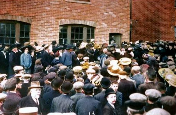 Crowds gather as the Right Hon John Burns MP, officially opens Yeovil's first council house in Southville, in this colourised photograph of Saturday 2 November 1912.