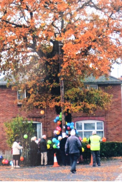 After the meal, the party travelled to the new estate where a large crowd had gathered in Southville. With a ceremonial key, surmounted by the town's coat of arms, Burns unlocked the front door of one of the houses, then proceeded to a roped-off area where he planted an oak tree. The tree, still known as the 'Burns Tree' survives to this day (see Gallery).