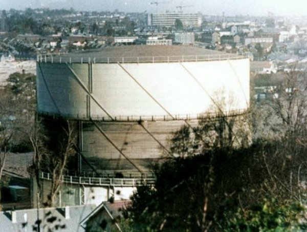 An aerial photograph of the gas holder near Lysander Road (running across the top of the photo). Photographed during the late 1960s or early 1970s.
