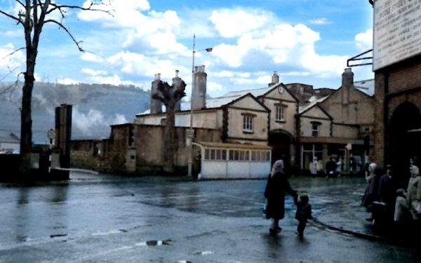 This colourised photograph, taken around 1960 from Central Road, is looking across Middle Street with the junction of Station Road (now Old Station Road) at extreme left. Right of centre the three-gabled building was the Town Gas Works offices, originally also accommodation for the Gas Works Manager and his family, (now, after an art deco makeover in the 1970s, converted to the shop of St Margaret's Somerset Hospice). At extreme right the building with the 'Middle Street Centre' sign was the earlier Railway Inn, now the site of the William Dampier. The entrance to Gas Lane was between the two trees at left, the site is now occupied by the former Key Markets House, later (2014) converted to a Premier Inn.