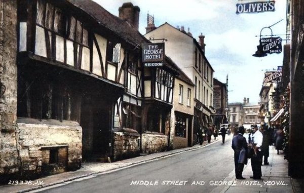 "We must not quit this part of our subject without saying a word about the most ancient house as well as hostelry in the town; we mean the George Inn (formerly the Three Cups Inn). It is worth a pilgrimage to Middle Street to look at it. For centuries it has afforded accommodation to man and horse; and if not as gray as St John's tower, it is nearly as old. There is painful tradition connected with this inn, which may, or may not, be true; but it is said that during the plague which visited this country, some travellers arrived at this inn in a waggon or cart; and that they brought with them the terrible disease. It soon spread over the town, destroying its hundreds, some say thousands; and the rank grass, nourished by the pestilential atmosphere, grew in the street, then a narrow thoroughfare, in which the inn is situated." (Daniel Vickery, 'Sketch of Yeovil' p.47) |