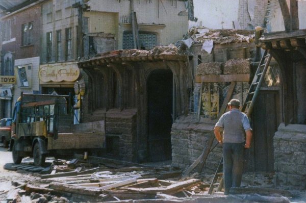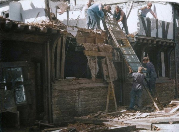 The George was a timber-framed building over low stone walls with a jettied (upper floor projecting beyond the dimensions of the floor below) upper storey in the style of a Wealden house. Indeed the George was regarded as the most westerly example of this style of domestic architecture usually found in the southeast of England (the term Wealden derives from the Weald of Kent). The form consists of a central hall open to the roof with jettied bays of two storeys at either end. Around the time the building became a tavern, in the mid-15th Century, a new floor was inserted in the great hall, making rooms on the new first floor.